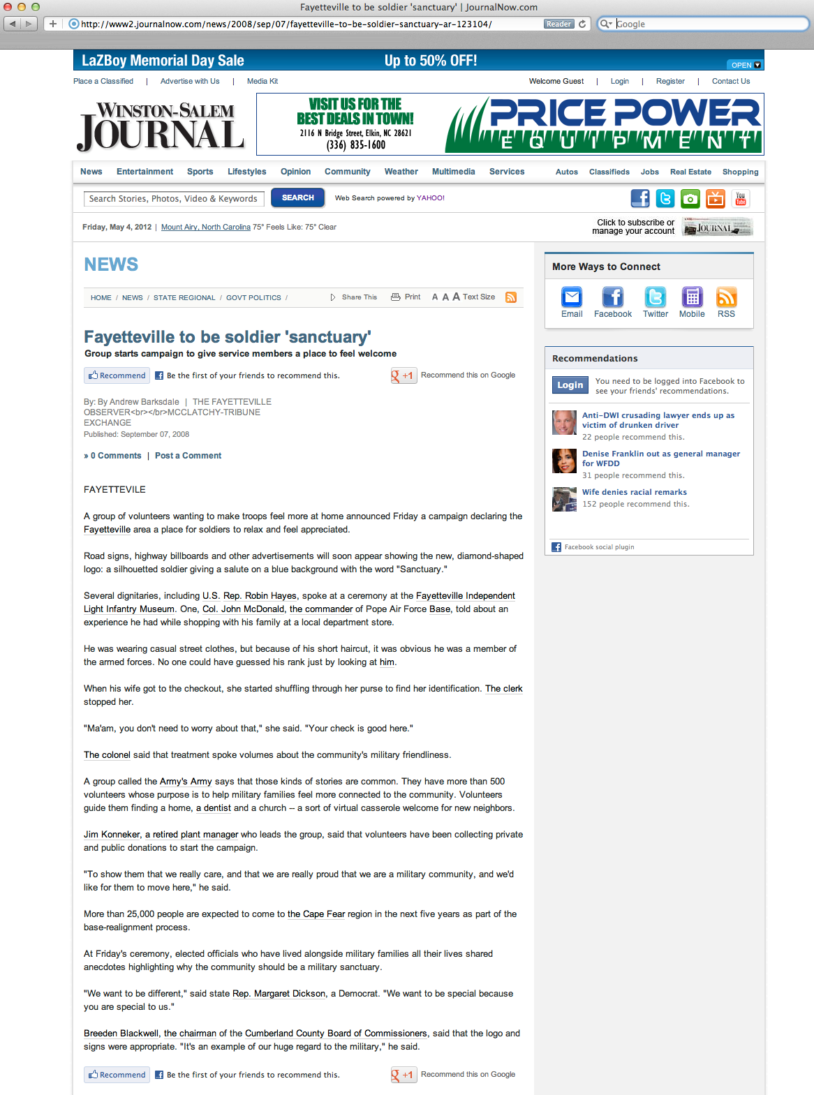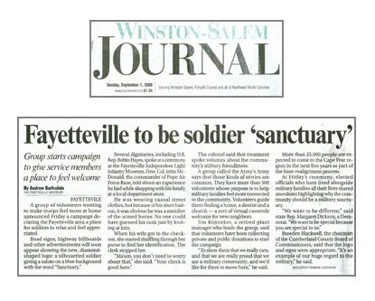 Winston-Salem Journal Features Sanctuary / Fayetteville FAYETTEVILLEARMYS ARMY Sep 4 Written By Guest User The Winston-Salem Journal covers Fayetteville to be soldier 'sanctuary'.Read more about it here. journalnow-com Guest User