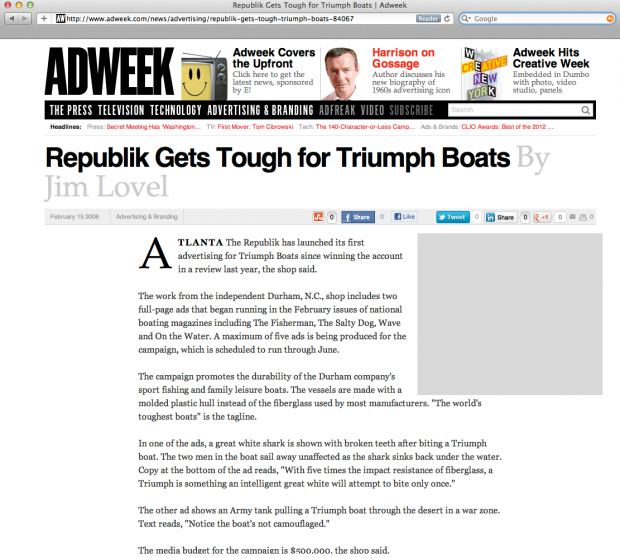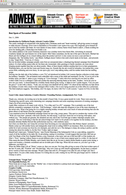 ADWEEK names Triumph spot by The Republik best of Nov 2006