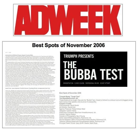 Adweek names 'Bubba Test' by the Republik a BEST SPOT for November 2006, along with commercials from Apple and Nike.Read more about the spot here and here