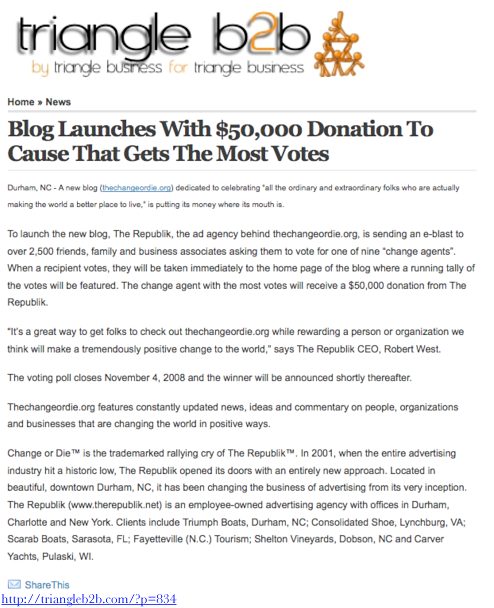 Triangleb2b features The Republik's Blog Launching With $50,000 Donation To Cause That Gets The Most Votes. Originally from Triangleb2b.com