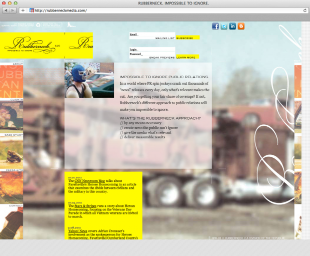 Established in 2002 as a subsidiary of the award-winning marketing company, The Republik, Rubberneck focuses on forging media relationships that launch, build and sustain brands. Our goal is to create proactive, ongoing campaigns that support our clients' marketing objectives and - most importantly - generate measurable results.