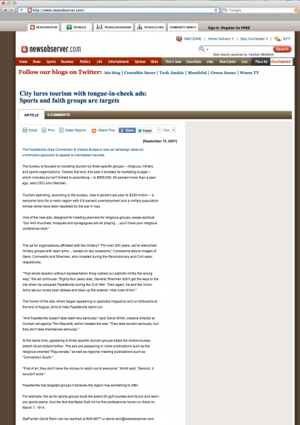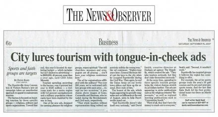 The Fayetteville Area Convention Camp & Visitors Bureau's new ad campaign takes an unorthodox approach to appeal to mainstream tourists News & Observer online.Read more about it from tmcnet.comOriginal article in News&Observer archives