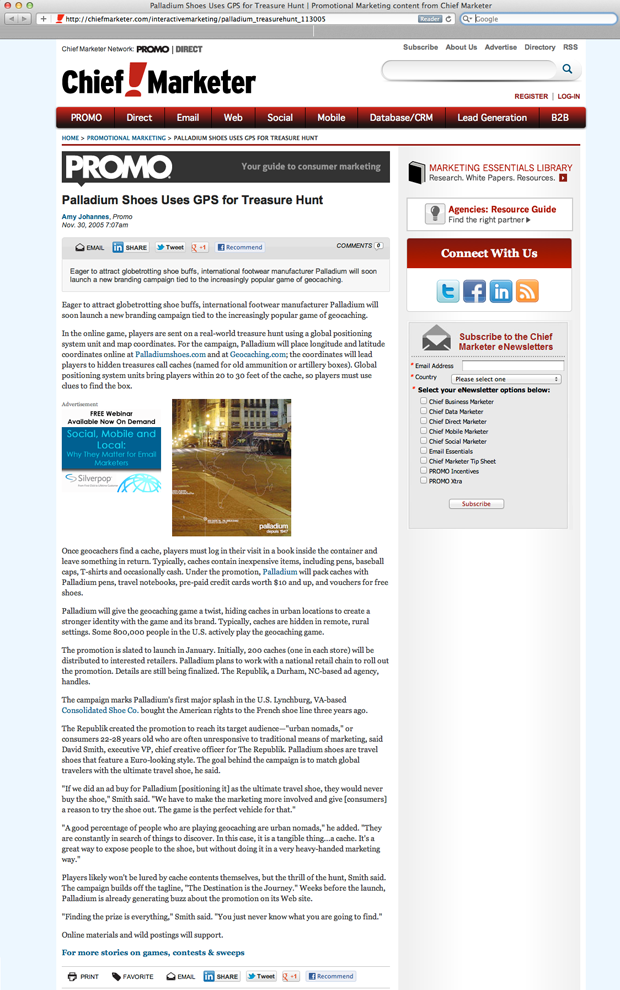 To drive awareness and interest we created the first commercial version of Geocaching - a GPS-based treasure hunt game - targeting a dedicated online community that mirrors Palladium's ideal customer.Read more about this at chiefmarketer.comSee the application in action