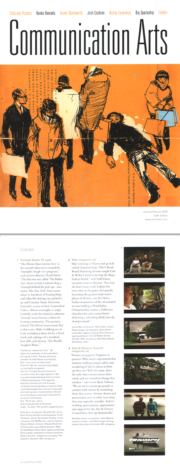 Triumph Boats TV spot "The Divine Intervention Test" is highlighted in the January/February 2008 issue of Communication Arts magazine.