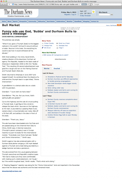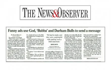 News & Observer and the Durham News report that Funny ads use God, "Bubba" and Durham Bulls to send a message.Read more about it here