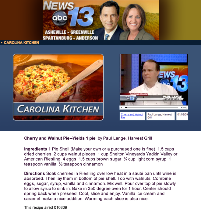 ABC 13 News's Carolina Kitchen Chef Paul Lange of the Harvest Grill at Shelton Vineyards. He shows how to make a Cherry and Walnut Pie. Read more about it hereGet the recipe here
