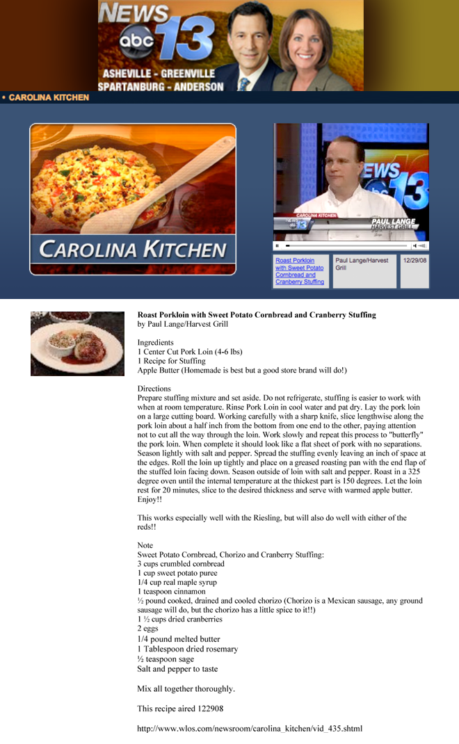 ABC 13 News's Carolina Kitchen Chef Paul Lange of the Harvest Grill at Shelton Vineyards. He shows how to make Roast Porkloin with Sweet Potato Cornbread and Cranberry Stuffing.