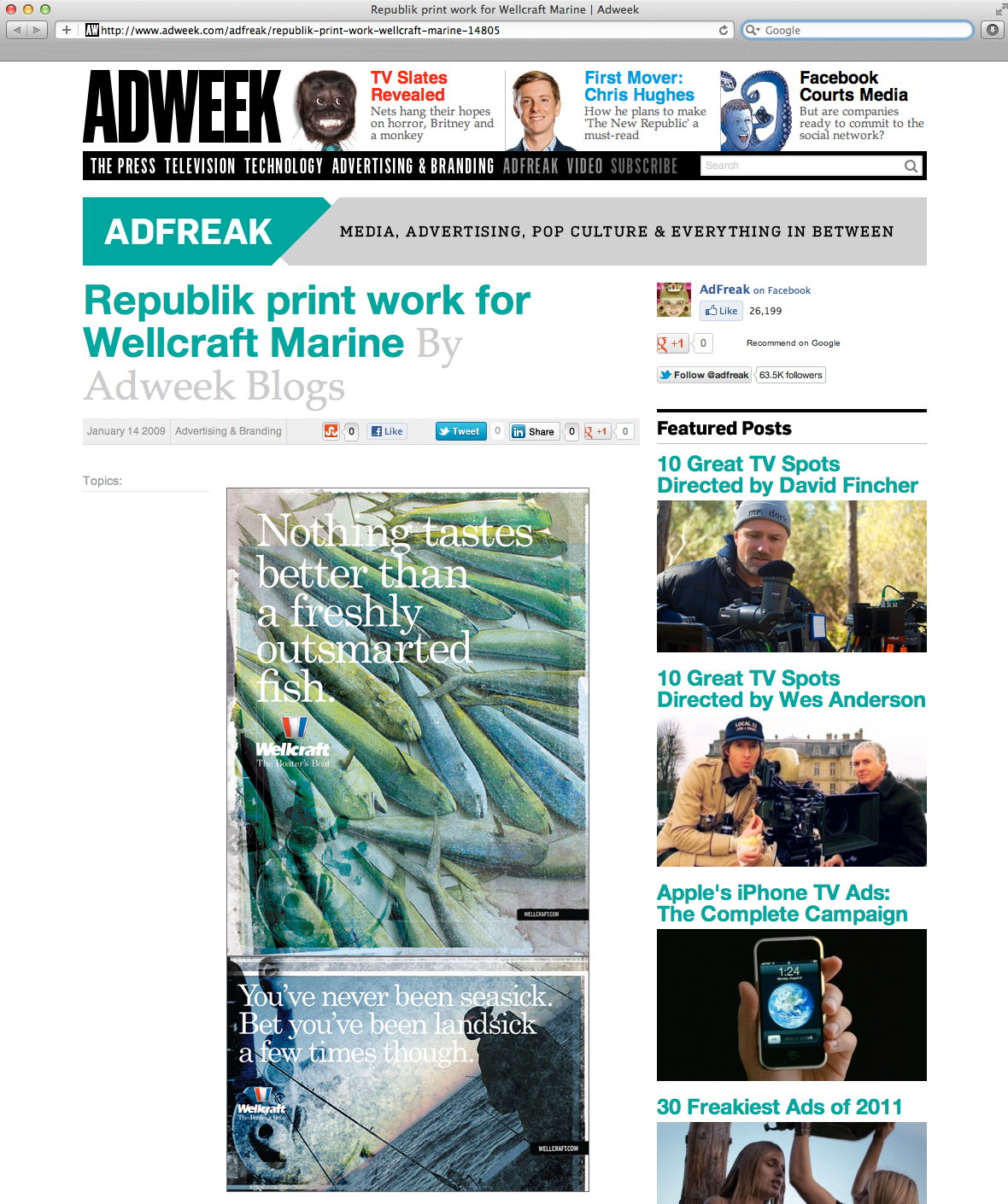 AdFreak Highlights The Republik THE REPUBLIKWELLCRAFT Jan 14 Written By Guest User Adfreak highlights The Republik's work for Wellcraft Marine. Read more about it here Adfreak Guest User