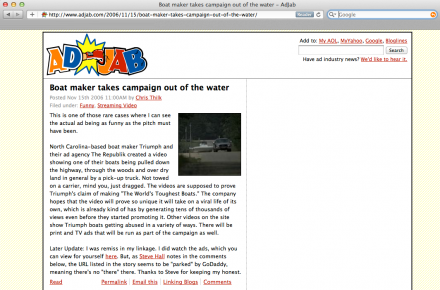 AdJab blogs about The Republik THE REPUBLIKTRIUMPH BOATS Nov 15 Written By Guest User AdJab says Triumph takes campaign out of the water!Read more about it here AdJab Guest User