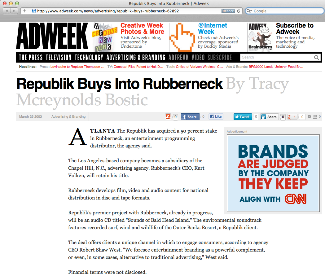 AdWeek covers The Republik THE REPUBLIK Mar 26 Written By Guest User According to AdWeek, the Republik has acquired a 50% stake in Rubberneck.Read more about it here AdWeek Guest User