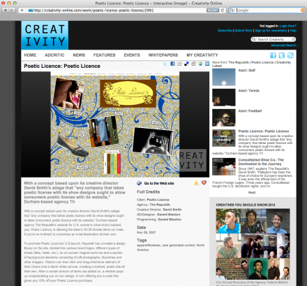 The Poetic Licence website, created by the Republik, is Creativity-Online.com's “Interactive Pick of the Day”.Read more about it hereOriginal article in Creativity-Online.com archives