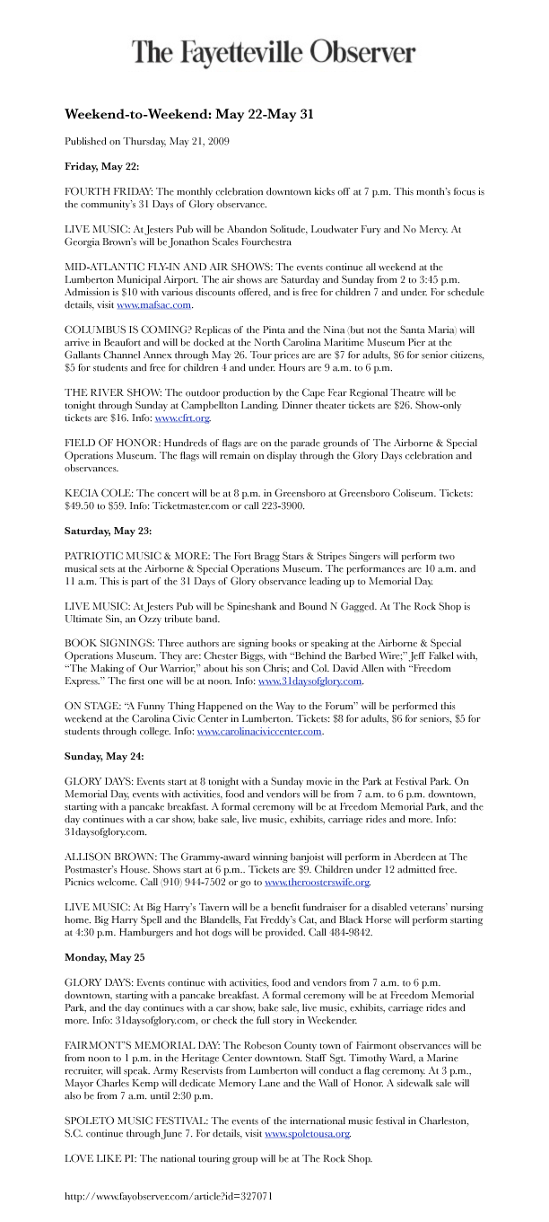 The Fayetteville Observer features Fayetteville. Original article in Fayetteville Observer archives