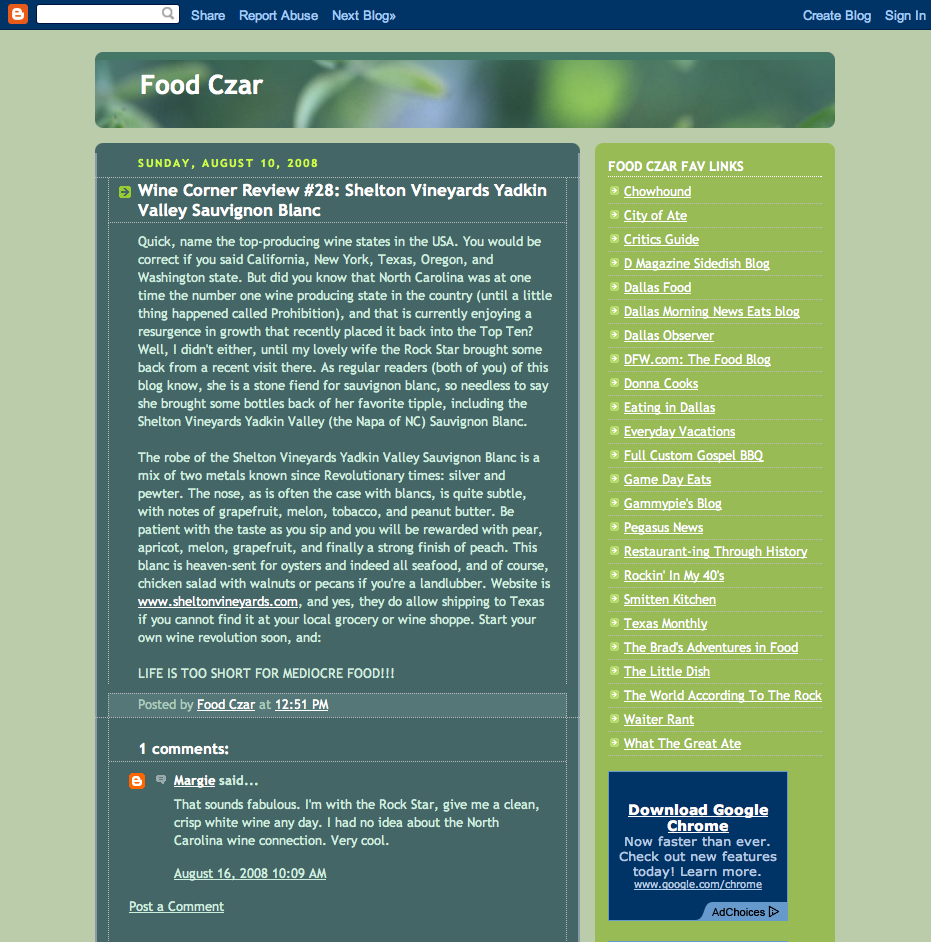 Food Czar Blogs About Shelton Vineyards SHELTON Aug 10 Written By Guest User Food Czar blogs a review of wine from Shelton Vineyards.Read more about it here Food Czar Blog Guest User
