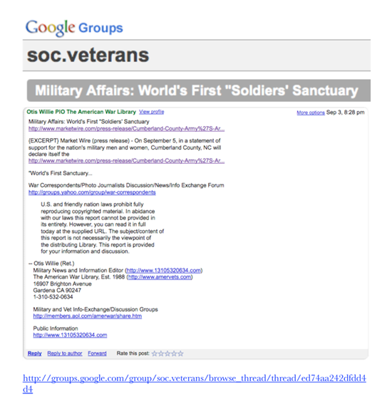 Google Groups features Army's Army and FayettevilleRead more:https://groups.google.com/forum/?fromgroups=#!topic/soc.veterans/7XSqJC391NQ