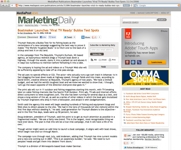 MediaPost features Triumph as they use the "Bubba Test" as the campaign centerpiece. The Republik is mentioned.Read more about it here