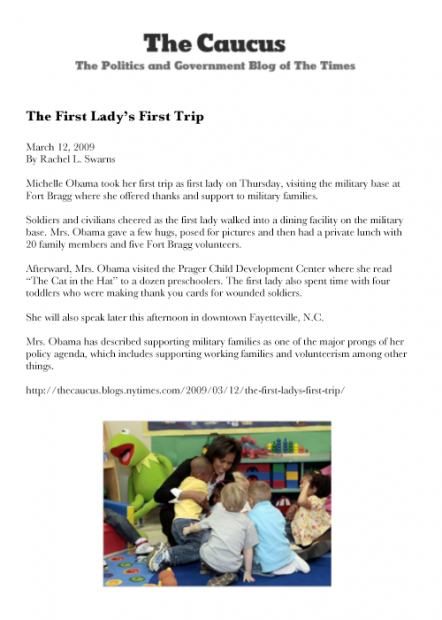New York Times features Army's Army and Fayetteville. Read more: http://thecaucus.blogs.nytimes.com/2009/03/12/the-first-ladys-first-trip/