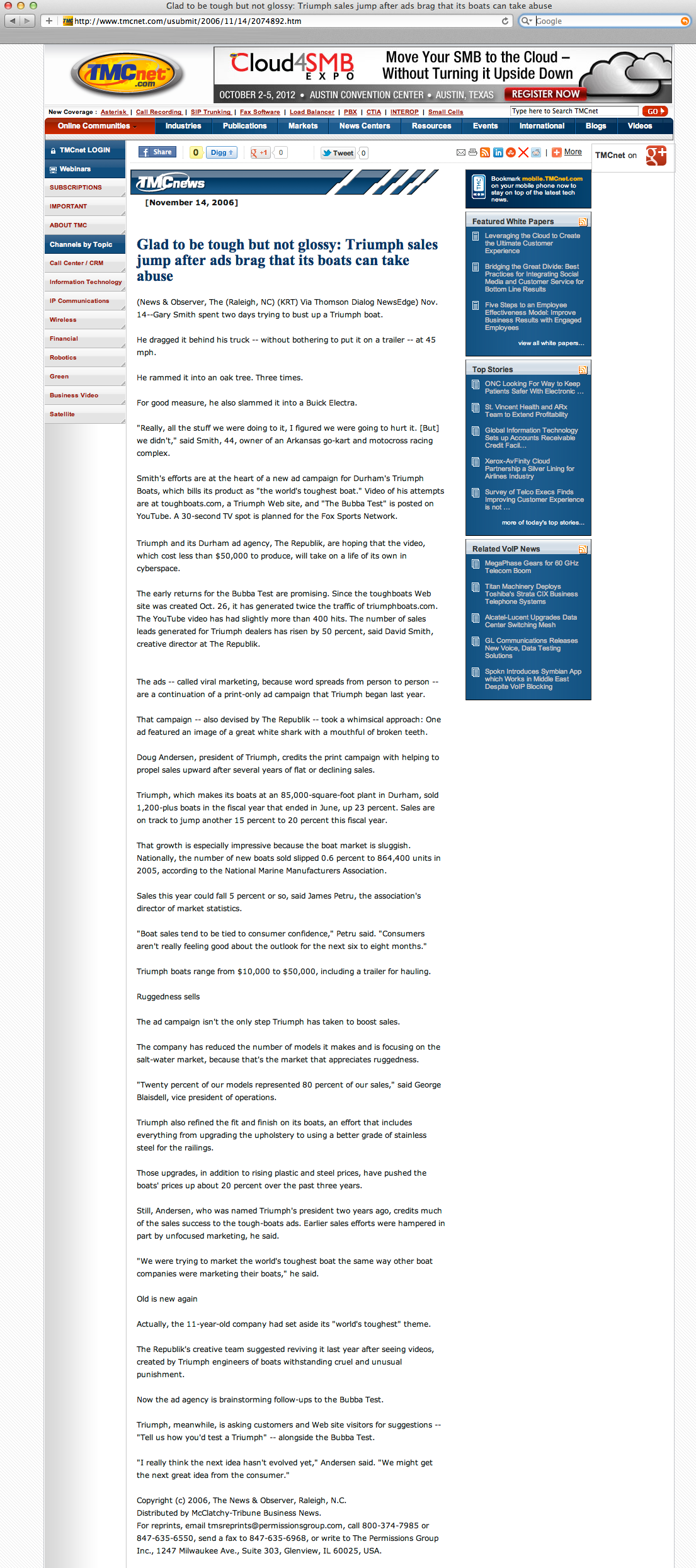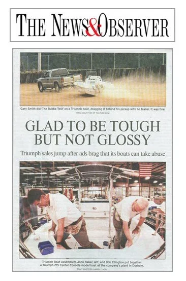News & Observer say that Triumph sales jump after ads brag that its boat can take abuse. The Republik is referenced.Read more about it hereOriginal article in News & Observer archives
