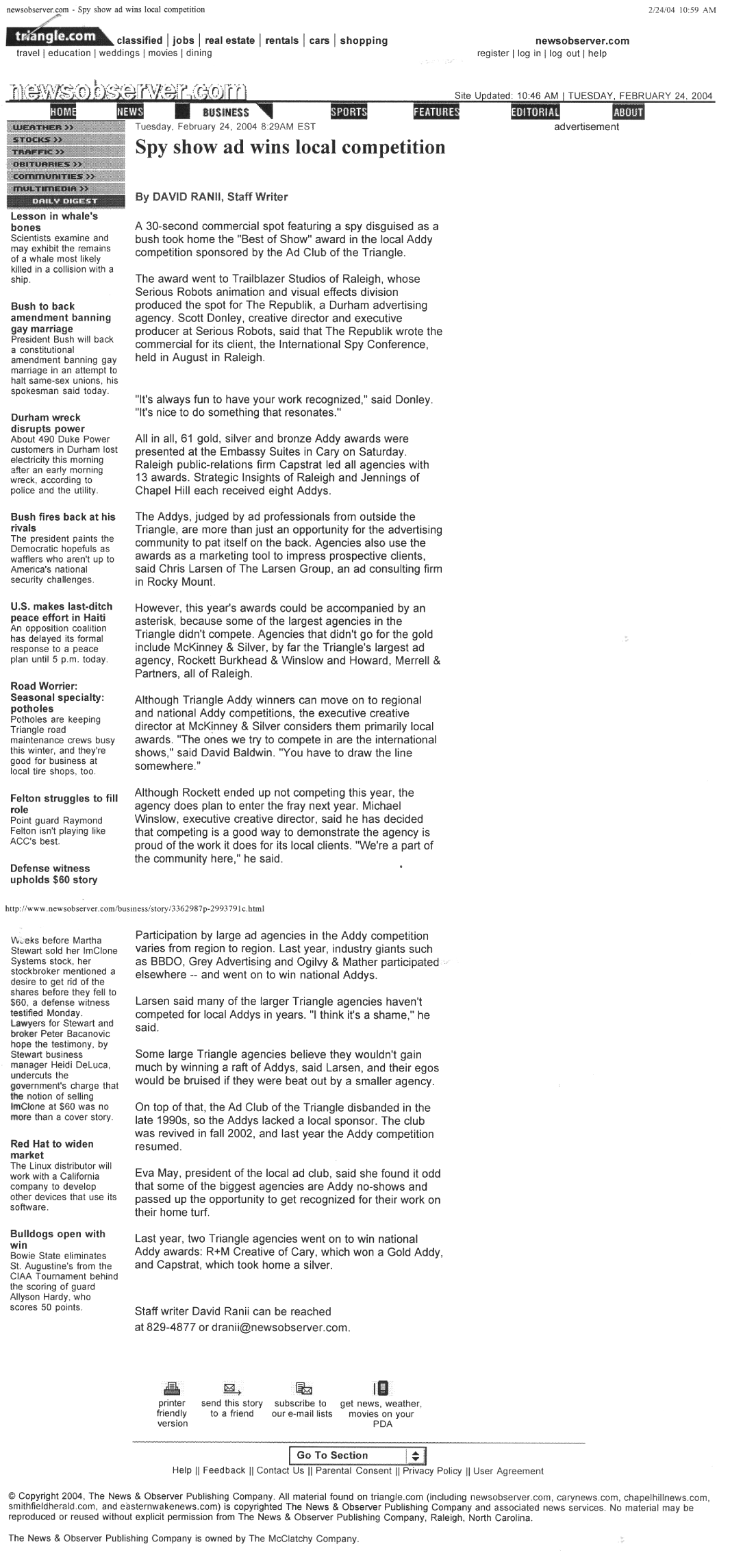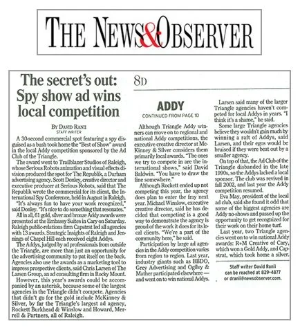 News & Observer spotlights the Republik's "Best in Show" win at the local Addy competition for the "Spies are Coming" ad created for the Raleigh International Spy Conference.Original article in News & Observer archives