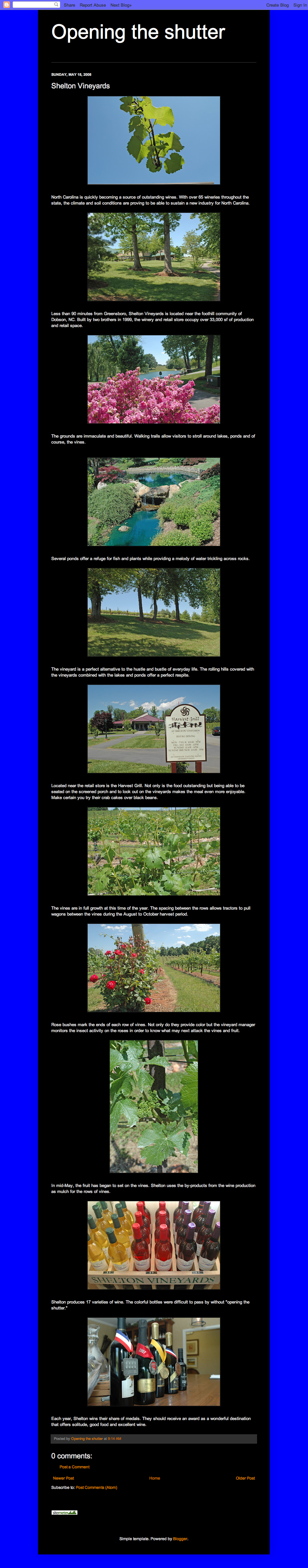 Opening The Shutter blogs About Shelton Vineyards SHELTON May 18 Written By Guest User Opening the Shutter blogs about Shelton Vineyards.Read more about it here Opening the Shutter Blog Guest User
