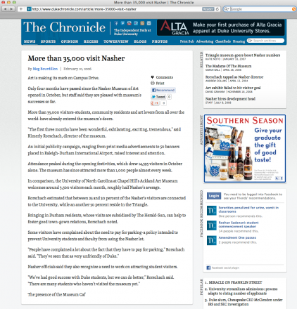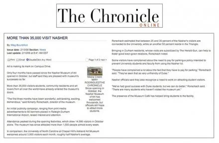 The Chronicle features the Nasher Museum of Art NASHER MUSEUM Feb 10 Written By Guest User More than 35,000 Visit Nasher, according to the Duke University Chronicle.Read more about it here The Chronicle Guest User