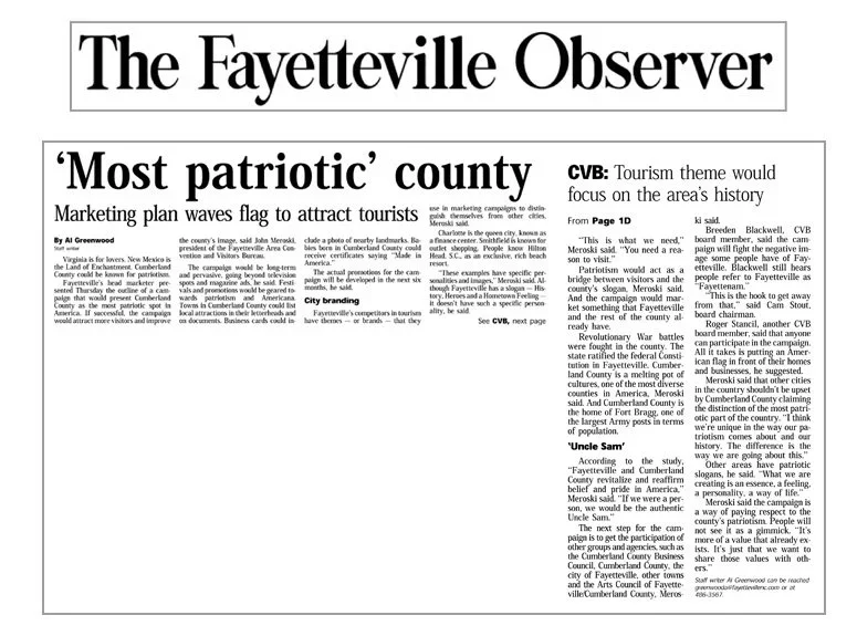 The Fayetteville Observer notes 'Most Patriotic' County FAYETTEVILLE Oct 15 Written By Guest User Read more about it hereOriginal article in The Fayetteville Observer archives Fayetteville Observer Guest User