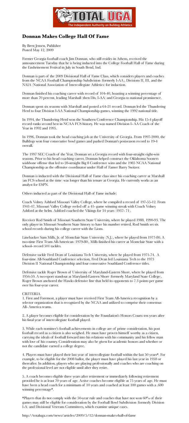 Total UGA reports that Jim Donnan of Buster Sports to join College Football Hall of Fame. Original article in Total UGA archives